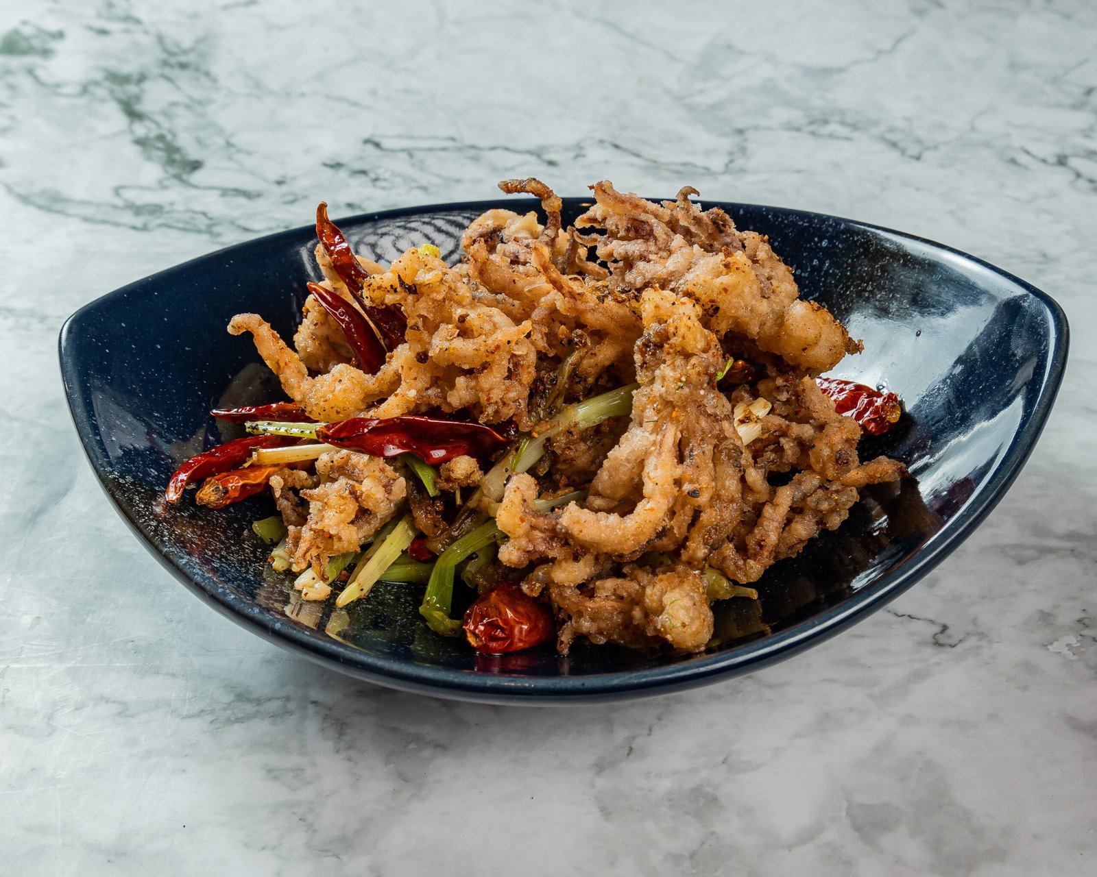 Arañitas de calamar salteado al wok aderezado con toques de sal y pimienta.