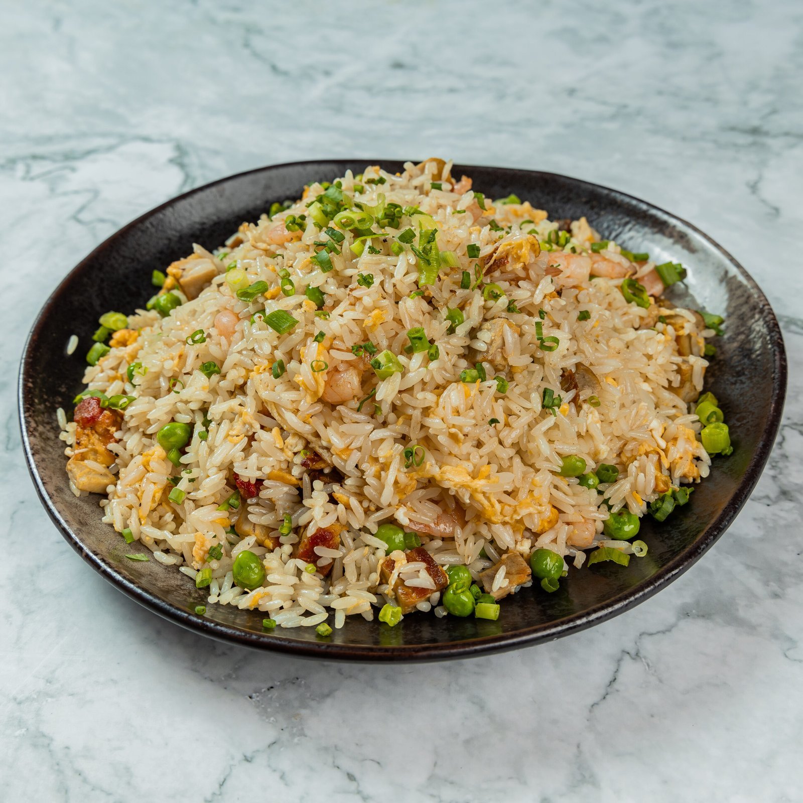 Arroz frito salteado en el wok con guisantes, cebollina, camarones y puerco.