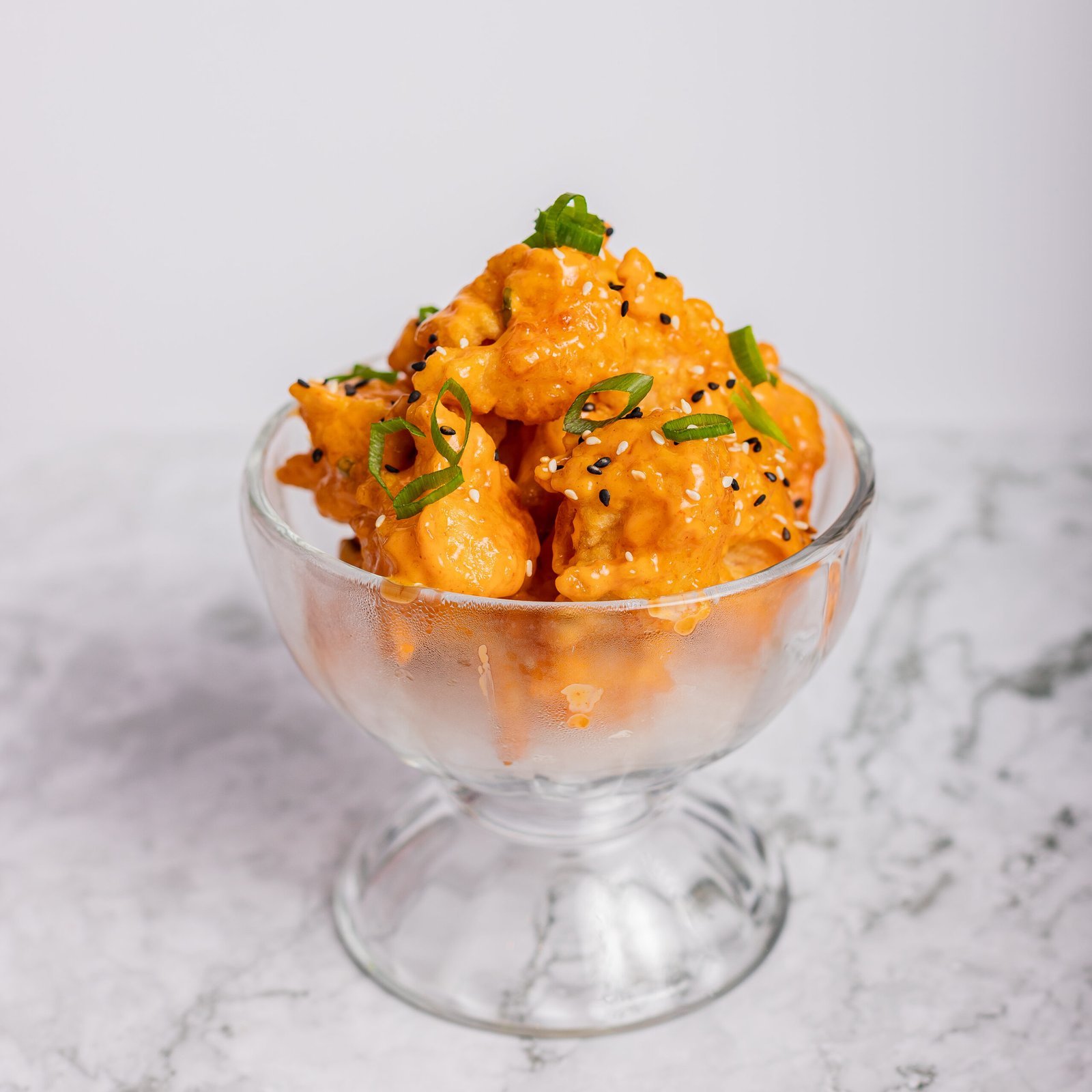 Crujientes camarones fritos bañados en rica salsa picante dinamita.