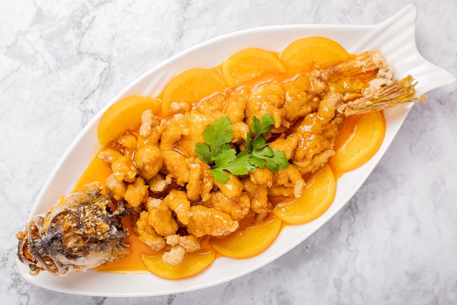 Pescado entero frito y laqueado, bañado en salsa naranja de la casa.